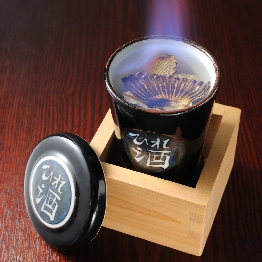 蓋を少しずつ取りながら火をつけるとアルコールが飛び、より美味しい「ひれ酒」としてお召し上がり頂けます。