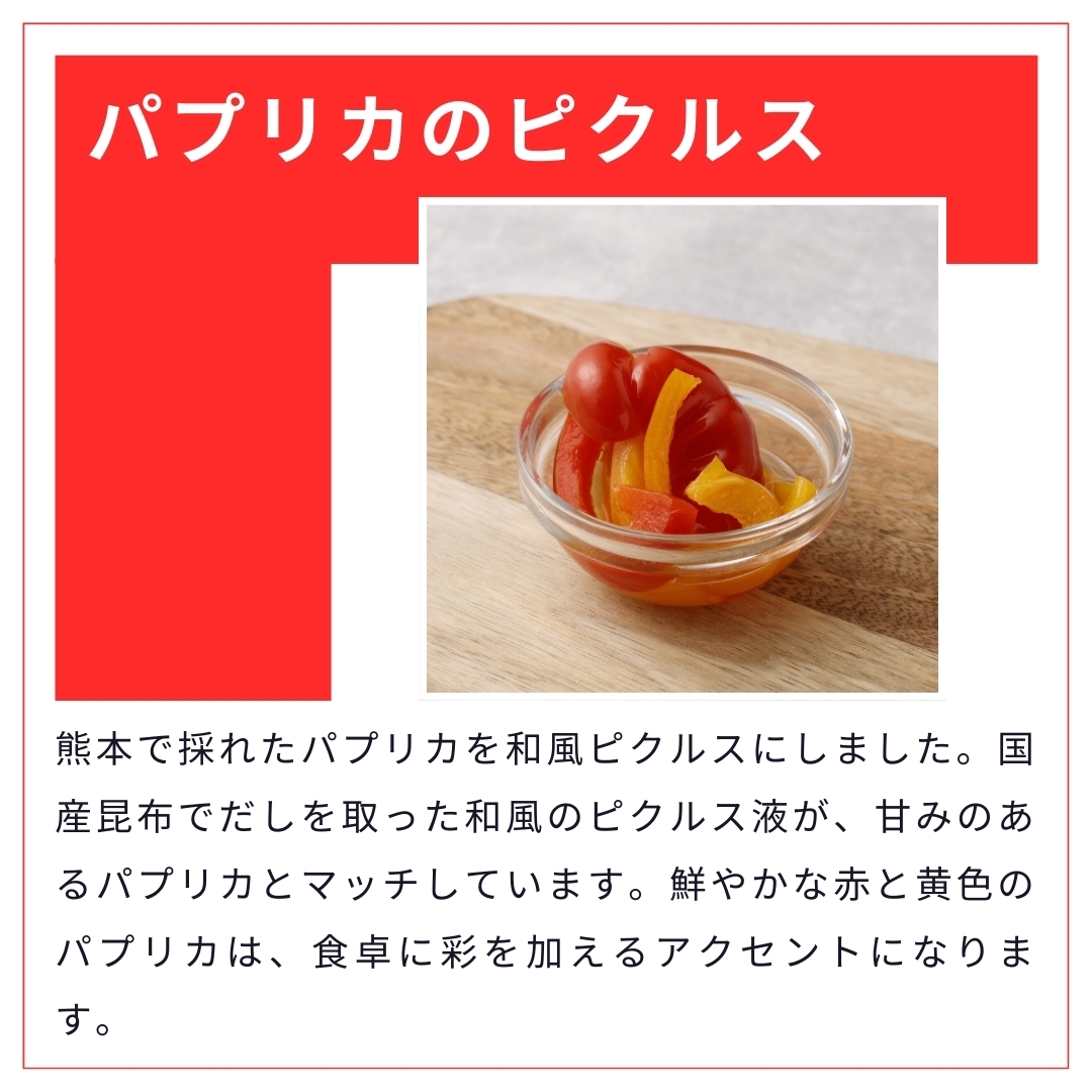 熊本みなみピクルスでは、熊本の食材とピクルス液の風味を工夫し、