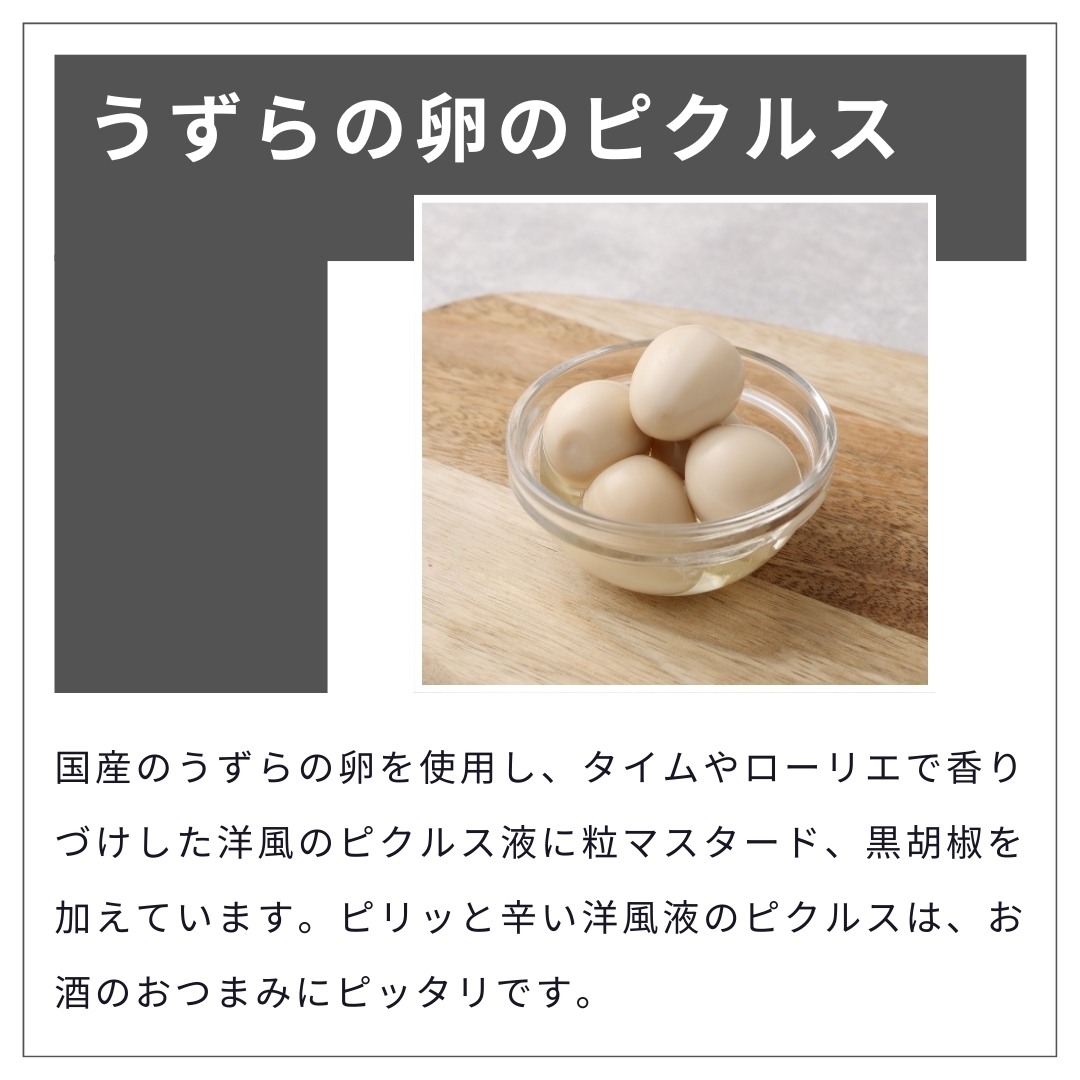 うずらの卵、穀物酢、砂糖、塩、粒マスタード、ローリエ、タイム
