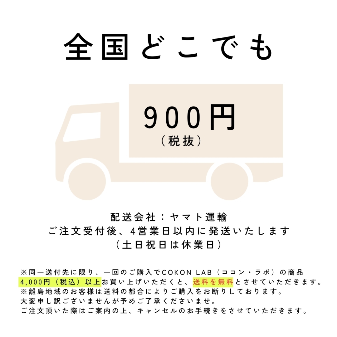 ※同一送付先に限り、一回のご購入でCOKON LAB(ココン・ラボ)の商品4,000円(税込)以上お買い上げいただくと、送料を無料とさせていただきます。