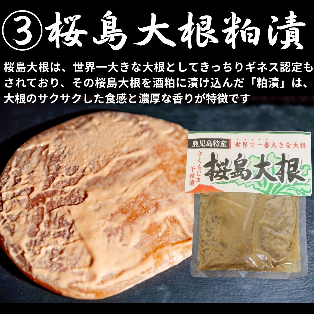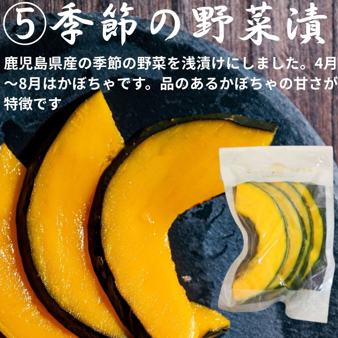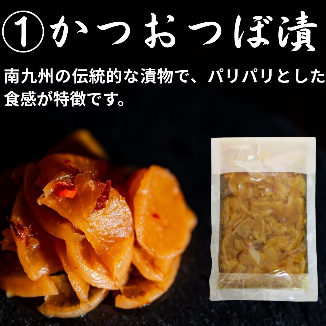 鹿児島のお漬物セット。人気の「かつおつぼ漬」をはじめ、鰹節工場で燻製された「燻製つぼ漬」、世界最大の大根「桜島大根の酒粕漬」、シャキシャキの「砂丘らっきょうの塩漬け」また、季節ごとに変わる「季節のお漬物」など、鹿児島の味をお届けします。
