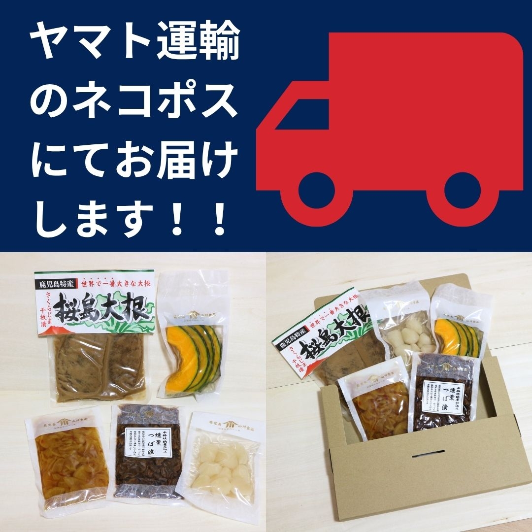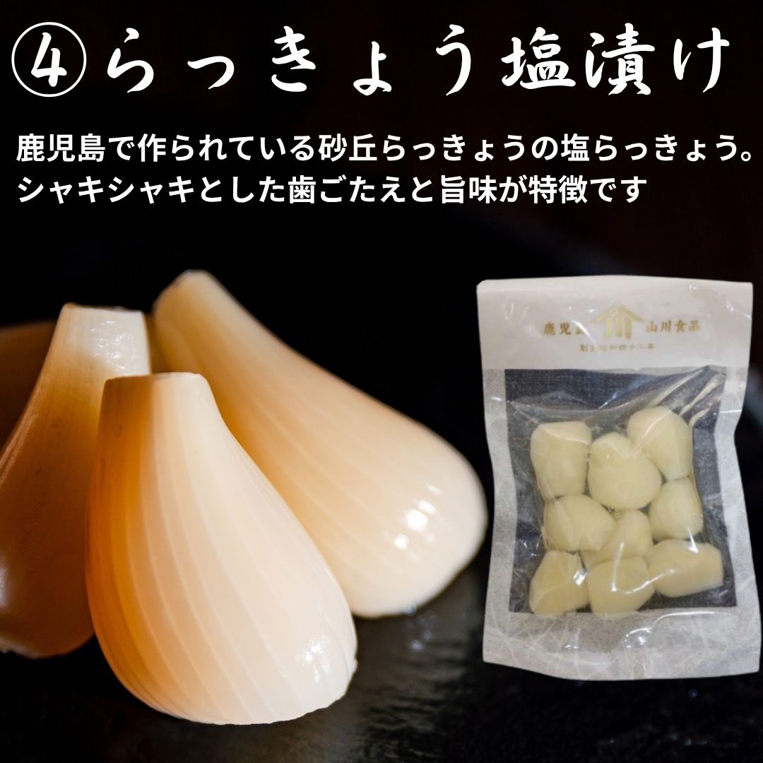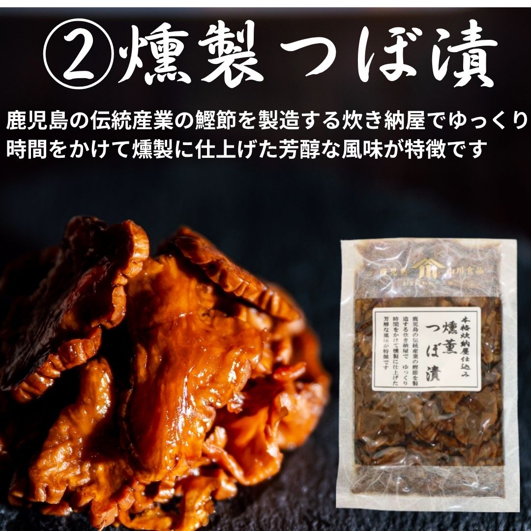 鹿児島のお漬物セット。人気の「かつおつぼ漬」をはじめ、鰹節工場で燻製された「燻製つぼ漬」、世界最大の大根「桜島大根の酒粕漬」、シャキシャキの「砂丘らっきょうの塩漬け」また、季節ごとに変わる「季節のお漬物」など、鹿児島の味をお届けします。