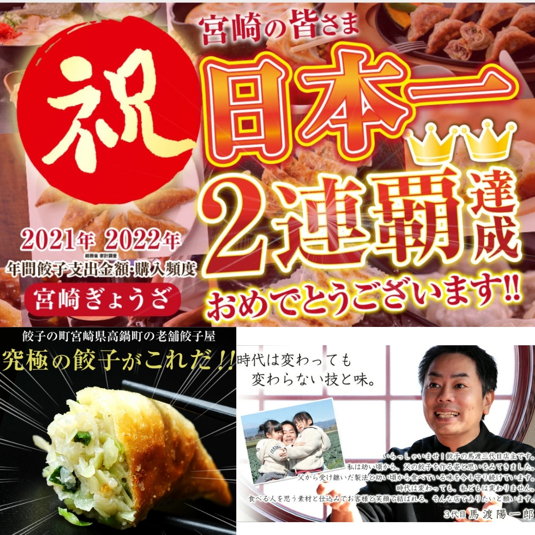 - \餃子大国:宮崎県/2021年・2022年の年間餃子支出金額・購入頻度は日本一!おいしい宮崎の餃子を取り寄せるなら、老舗専門店である餃子の馬渡をご利用ください。 宮崎県産のニラやにんにく、国産の玉ねぎや合挽肉などの食材を使用し、素材の味を最大限に活かしたもっちりとした食感が人気です。定番の焼き餃子からえびしそ餃子、手羽餃子など餃子のラインナップが充実しており、子供から大人までどなたでもお楽しみいただけます。調理方法・焼き方も簡単ですので、こだわりの餃子をぜひ一度味わってみてください。